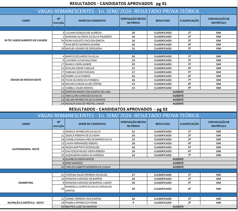 Inscrições presencias de 23/02/2026 as 27/02/2026 Saiba mais no edital abaixo RESULTADO – LISTA DE CLASSIFICAÇÃO GERAL DOCUMENTOS NECESSÁRIOS PARA A MATRÍCULA originais + cópias simples ENSINO MÉDIO- M-TEC ENSINO TÉCNICO
